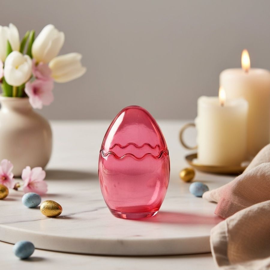 O Ovo de Vidro Vermelho P é uma peça decorativa elegante e versátil, ideal para compor arranjos, enfeitar mesas e complementar decorações temáticas. Seu design em vidro vermelho translúcido traz brilho e sofisticação, tornando-o perfeito para a Páscoa, festas ou ambientes com estilo refinado.