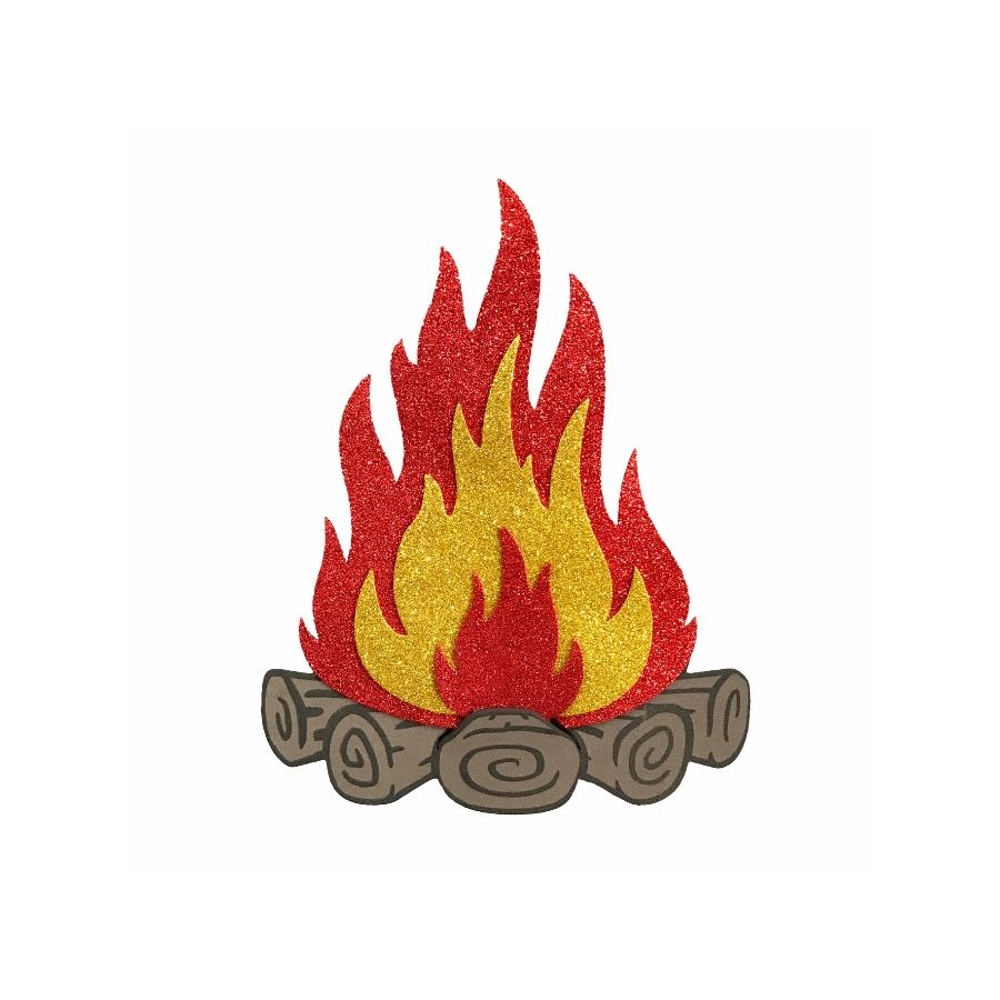 Painel de EVA com glitter no formato de fogueira, com 30x26,5cm, ideal para decorar festas juninas com estilo e brilho.