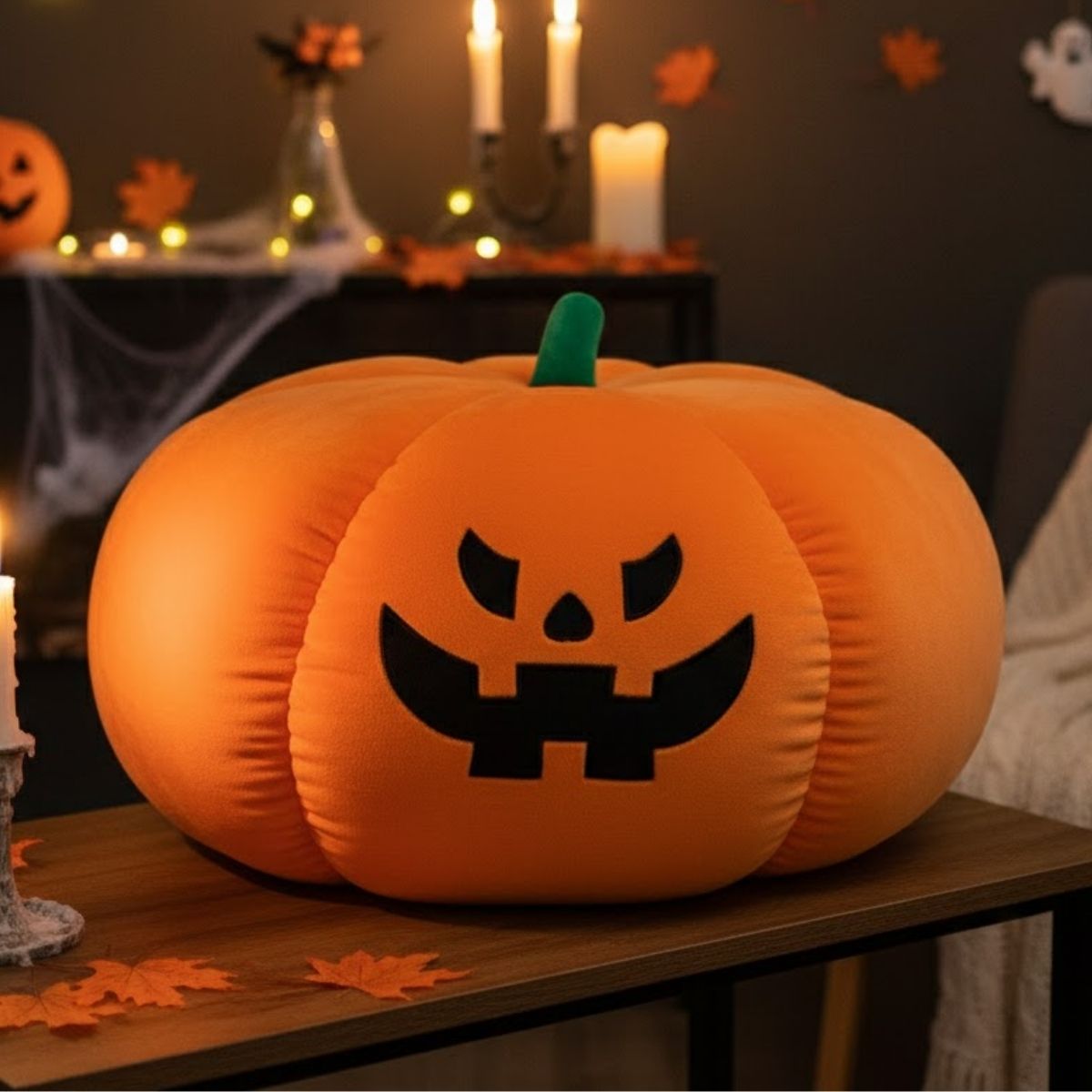 A Pelúcia de Halloween – Abóbora Gigante com Rosto – 50cm é o item perfeito para deixar sua decoração temática ainda mais divertida e acolhedora. Em formato de abóbora grande e levemente achatada, ela traz um rosto expressivo e simpático, criando aquele equilíbrio ideal entre o clima festivo do Halloween e a fofura que só uma pelúcia oferece. Seu tamanho de 50cm garante destaque na decoração, tornando-a uma peça marcante para ambientes internos.