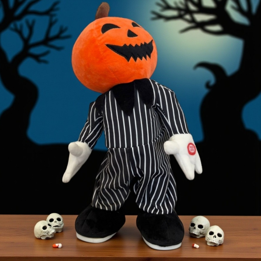 Pelúcia decorativa de Halloween em formato de abóbora dançarina, equipada com som e movimento. Mede 16x33x13cm, confeccionada em material macio e resistente, ideal para complementar decorações internas com interação e diversão temática.