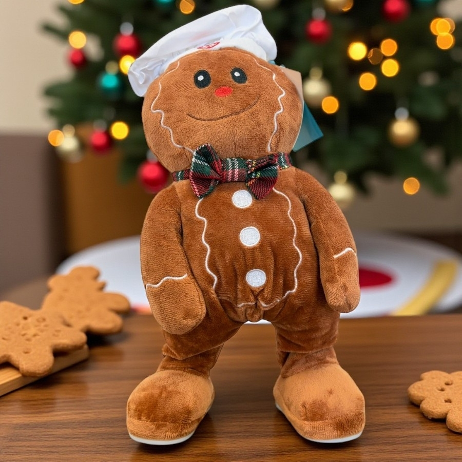 Pelúcia decorativa de Natal em formato de boneco de gengibre com chapéu branco, equipada com som e movimento. Mede 18x32x11cm, confeccionada em material macio e resistente, ideal para complementar ambientes internos com interação, alegria e espírito natalino.