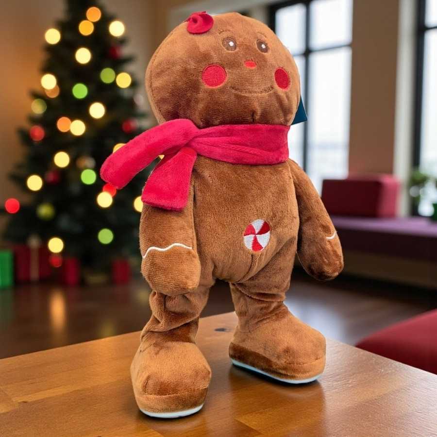 Pelúcia decorativa de Natal em formato de boneco de gengibre com cachecol, equipada com som e movimento. Mede 18x32x11cm, confeccionada em material macio e resistente, ideal para complementar ambientes internos com interação, diversão e espírito natalino.