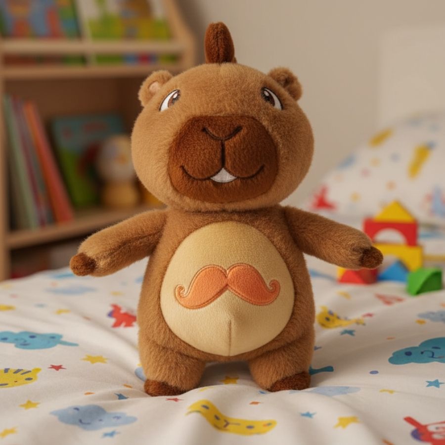 Pelúcia oficial Mundo Bita Capivara, 28cm, em poliéster macio, com bigodinho bordado e toque aveludado, perfeita para brincar, decorar e presentear crianças.