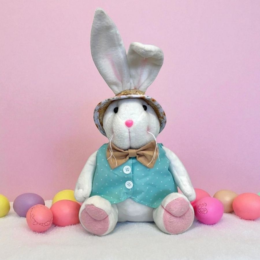 O Peso de Porta Coelhinho de Chapéu - 34cm é um enfeite encantador e funcional, perfeito para complementar a decoração de Páscoa ou trazer um toque lúdico a qualquer ambiente. Este coelhinho branco apresenta detalhes delicados em rosa e veste um colete turquesa com bolinhas, gravata bege e chapéu de palha com borda floral, criando uma combinação alegre e sofisticada. Sentadinho, ele combina charme e praticidade, servindo como peso de porta resistente graças ao enchimento de pedras.