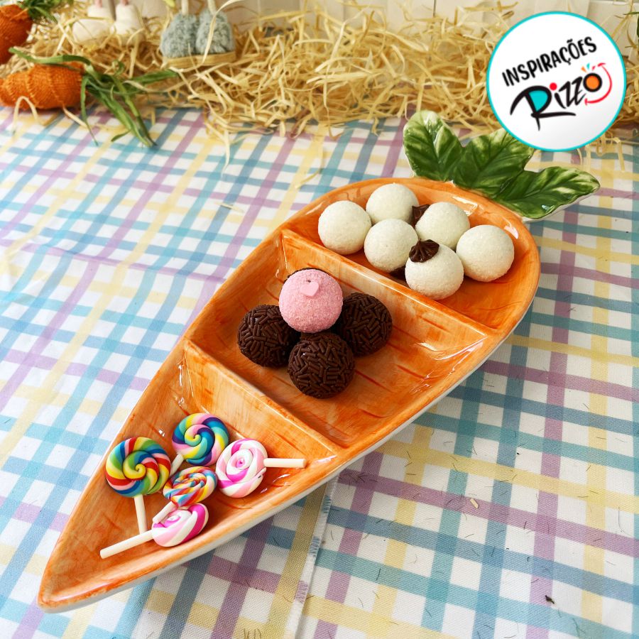 Petisqueira de Páscoa em cerâmica no formato de cenoura, medindo 34cm. Ideal para servir petiscos com charme e sofisticação.