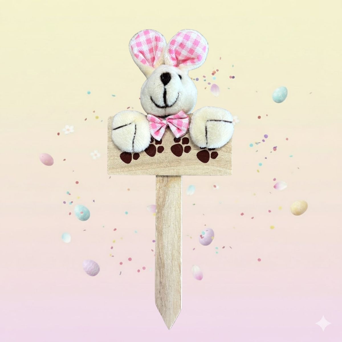 A Plaquinha de Páscoa em MDF com coelho xadrez é um enfeite delicado e cheio de charme para compor a decoração pascal. Na cor rosa, a peça apresenta um coelhinho apoiado na parte superior, com orelhinhas em estampa xadrez e um laço decorativo, criando um visual lúdico e acolhedor.
