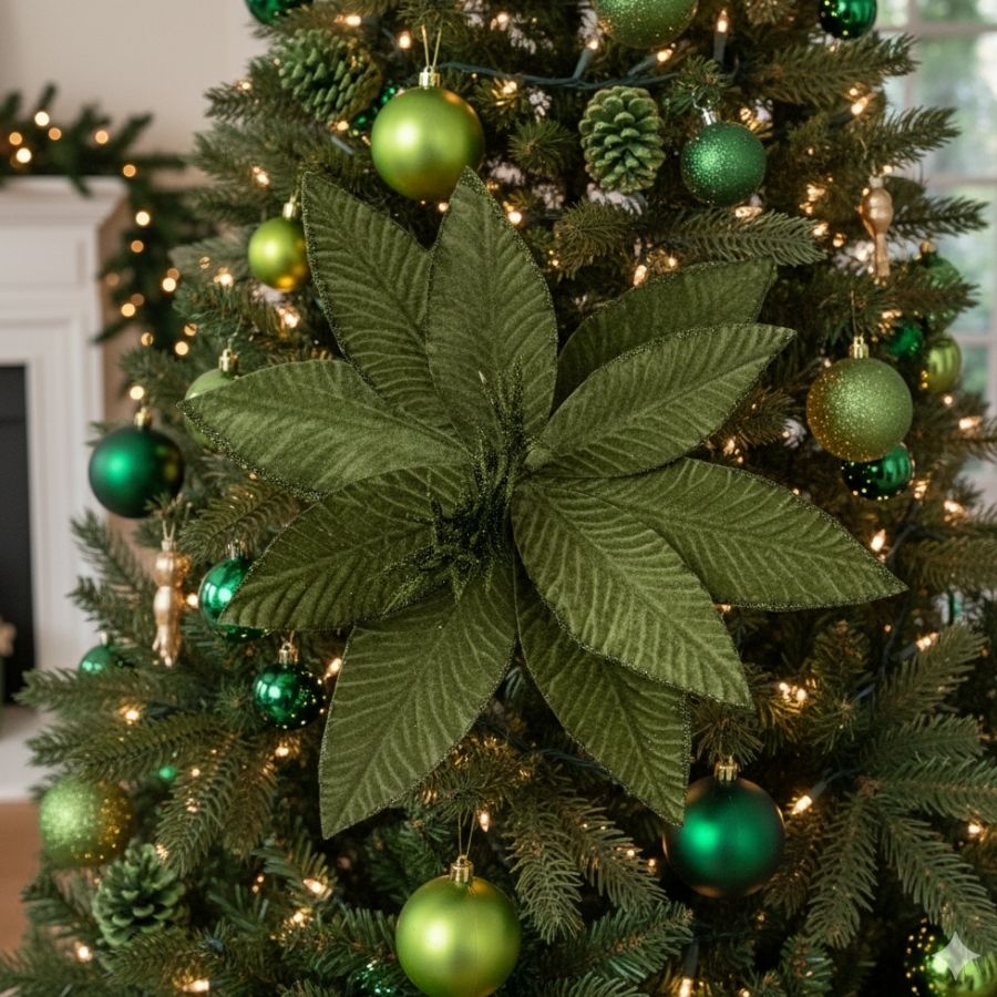 Poinsétia decorativa Cromus verde em camurça com glitter, 43x34cm, resistente e elegante, ideal para árvores, guirlandas e arranjos natalinos sofisticados.