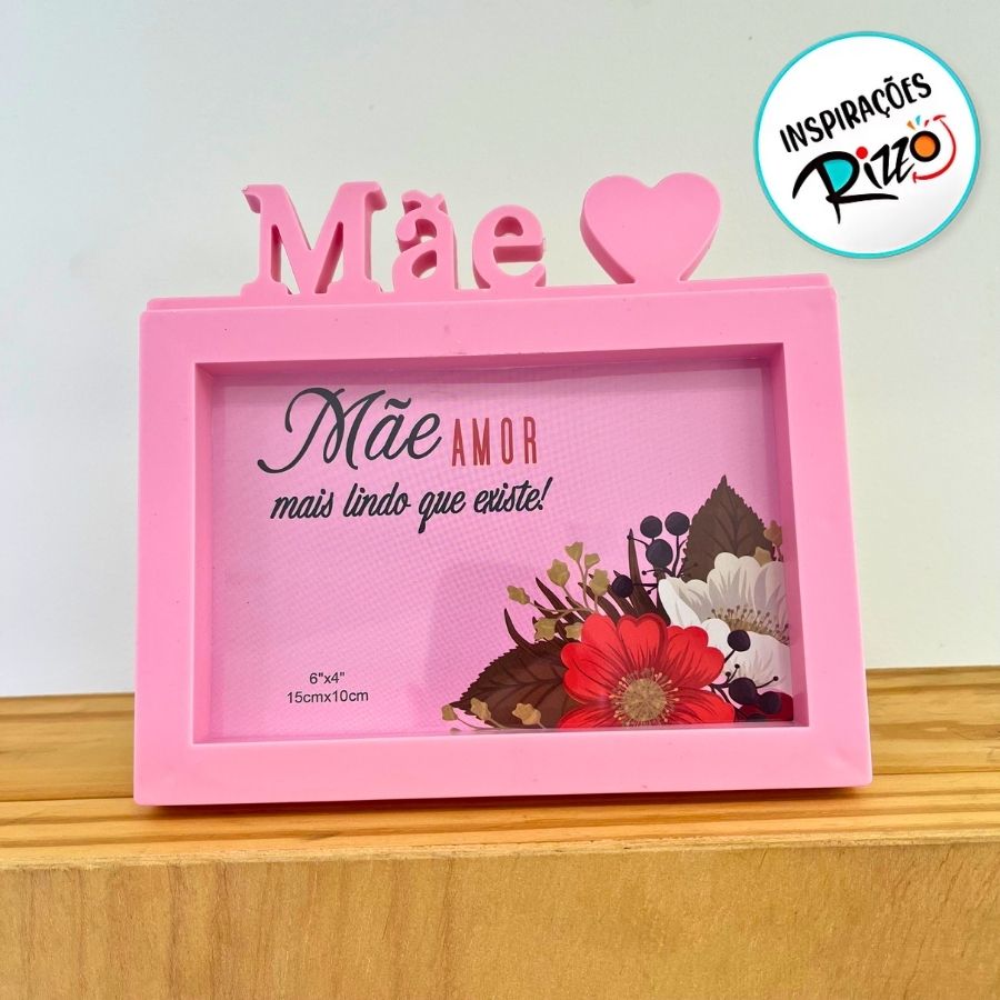 O Porta-Retrato Rosa Retangular com Moldura - Mãe Amor Mais Lindo que Existe tem 15x17cm, comporta fotos de 10x15cm e possui estrutura resistente, sendo uma opção encantadora para valorizar lembranças especiais.