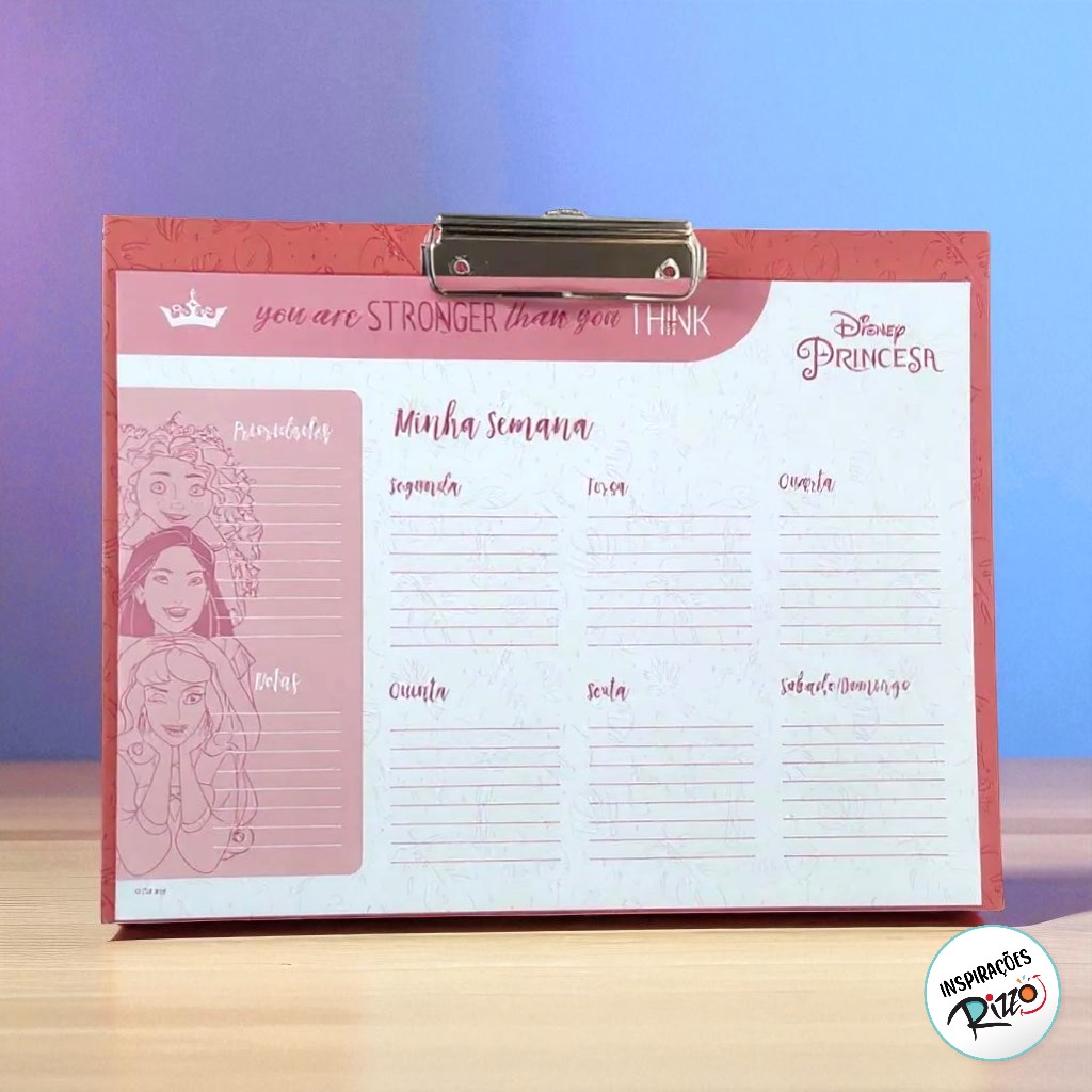 Prancheta com Planner - Princesas - 310x230mm Leve a magia das Princesas Disney para sua rotina com esta prancheta horizontal encantadora! Com formato 310x230mm, acompanha 12 folhas de planner semanal decorado com as princesas mais queridas. Ideal para planejar estudos, tarefas e sonhos.