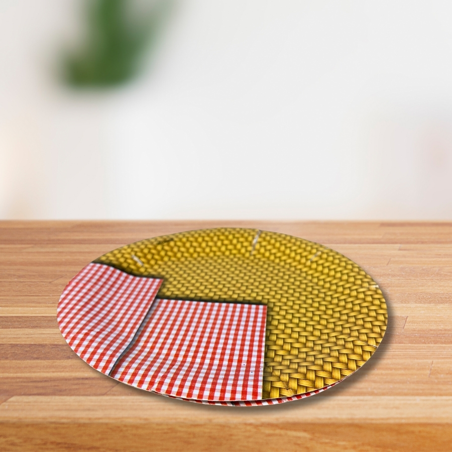 Prato redondo com 18cm de diâmetro e estampa de palha, perfeito para servir pratos típicos em festas juninas com charme rústico.