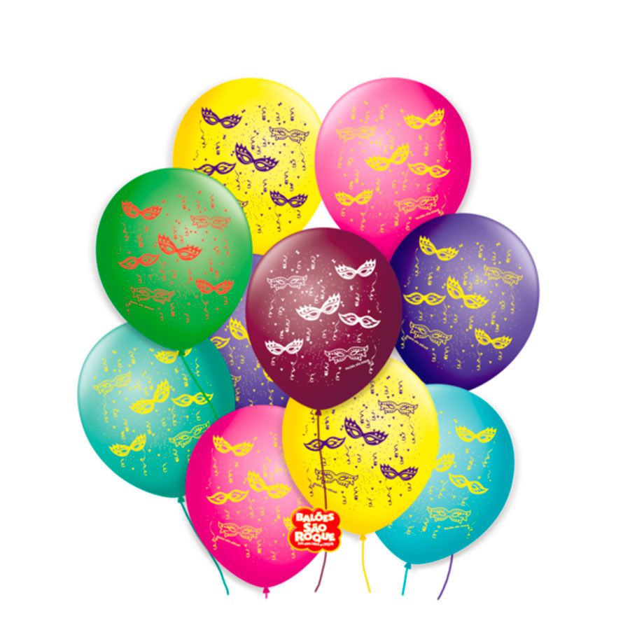 Um pacote de balões São Roque sortidos com o tema de carnaval, tendo as dimensões de 9 polegadas ±23 centímetros