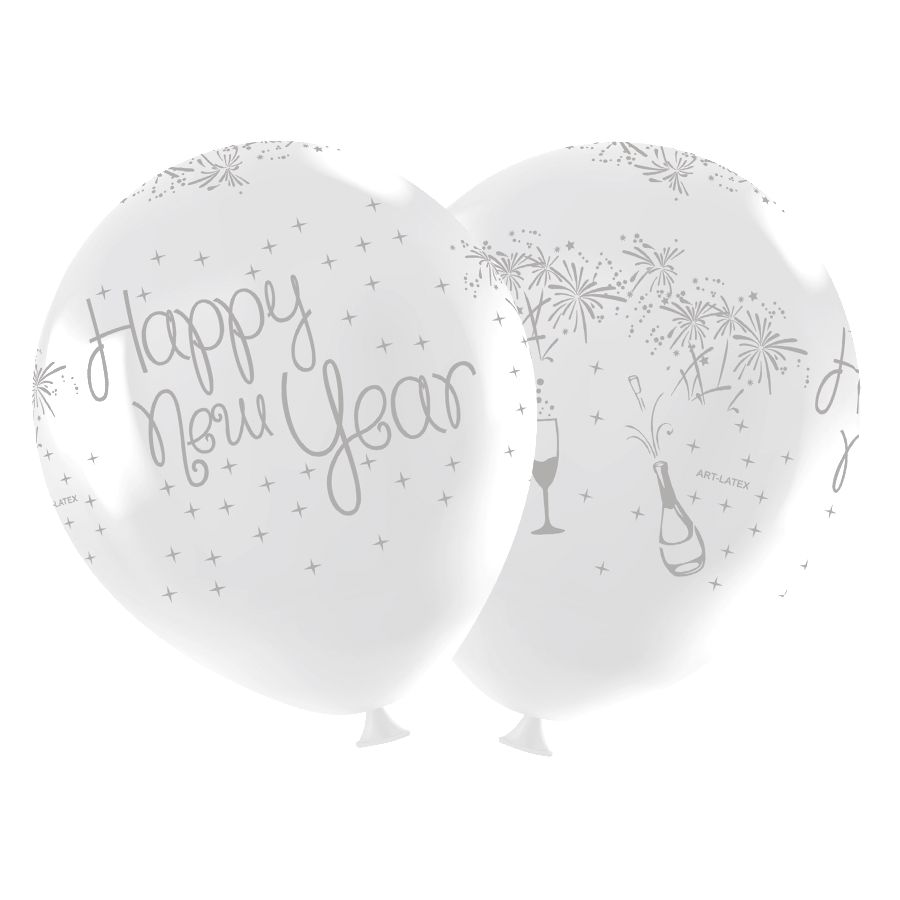Balão de Festa Redondo Profissional Látex Decorado 11" 28cm - Happy New Year Branco - 25 Unidades - Art-Latex