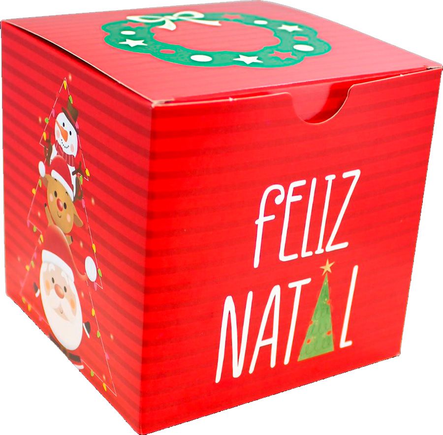 Caixa em forma de cubo com o tema natalino do papai noel. Produto nas cores vermelho, verde e branco.