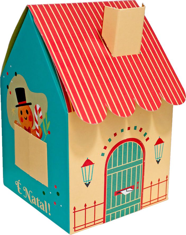 Caixa feita de papel cartão no formato de uma casinha de natal, nas cores vermelho bege e azul, contendo desenhos natalinos como, uma árvore, um urso polar e um biscoito de gengíbre. Pacote contém 10 unidades. Produto vem desmontado
