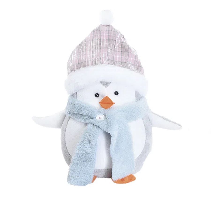 O pinguim feito de pelucia possuí gorro rosa, cor cinza, barriga branca, patas e bicos laranja, cachecol azul e seu tecido imita uma pelucia.