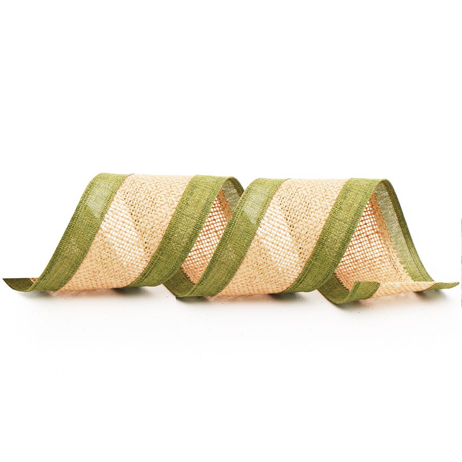 Fita de juta no modelo listra central na cor natural e verde, medindo 6,3 cm x 9,14 m.