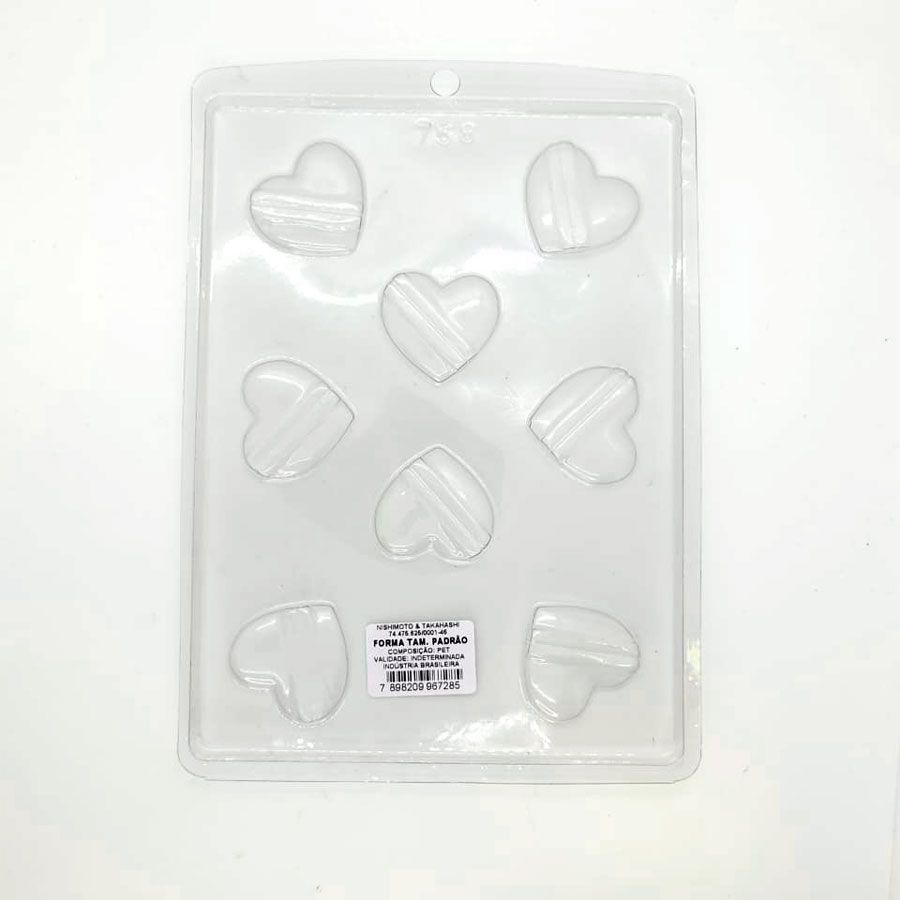 Uma forma de acetato com16,6cm de largura por 23cm de altura e 8 cavidades no formato de coração cum uma faixa em relevada tendo a profundidade de 0,05cm