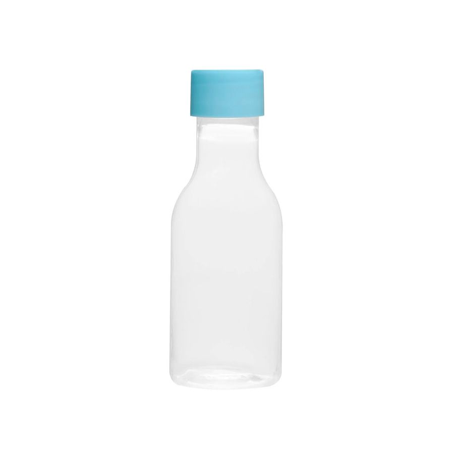 Possui 10 mini garrafinhas de plástico com tampa azul bebê com a capacidade de armazenar 50ml