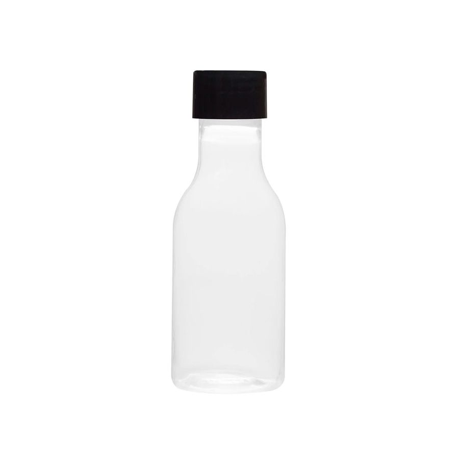 Possui 10 mini garrafinhas de plástico com tampa preta com a capacidade de armazenar 50ml