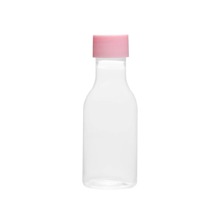 Possui 10 mini garrafinhas de plástico com tampa rosa com a capacidade de armazenar 50ml
