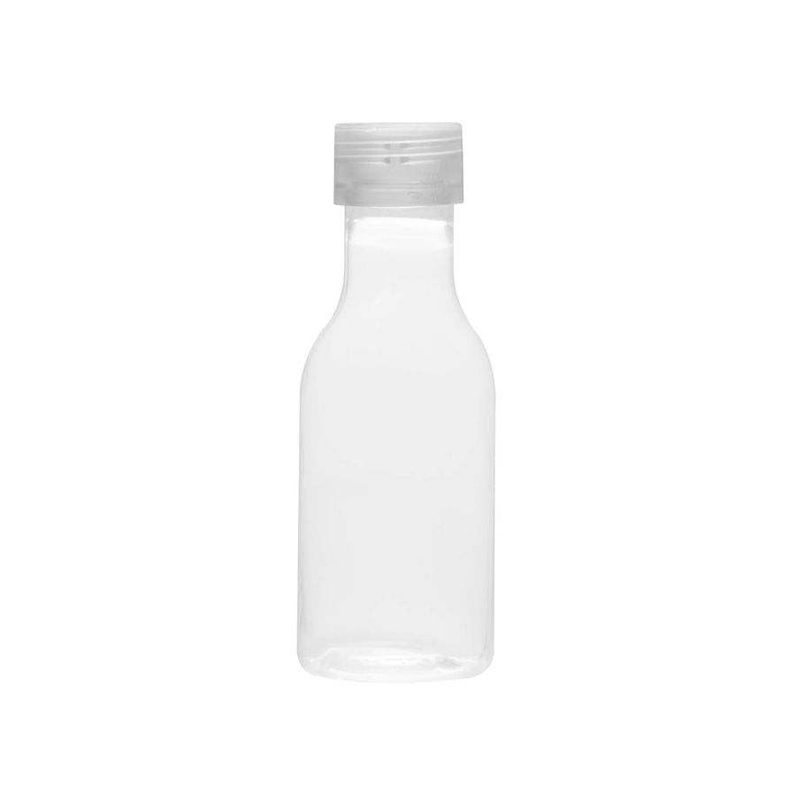 Possui 10 mini garrafinhas de plástico com tampa transparente com a capacidade de armazenar 50ml