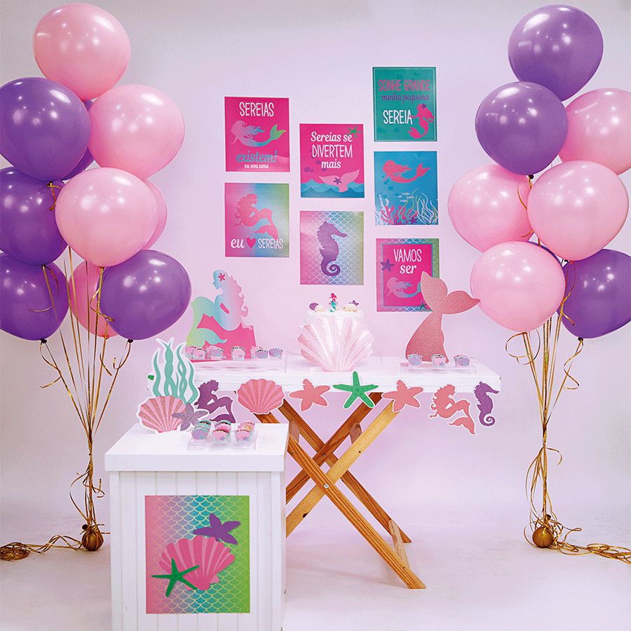 Decoração Festa Sereia. Este novo lançamento da Cromus é também conhecido pelas mamães como Festa Eu Acredito em Sereias, Pequena Sereia, Encanto da Sereia. Explorando a riqueza e a magia do mundo marinho, as escamas, flores, sereias, cavalos marinhos, bolhas, conchas e estrelas do mar, nas cores Rosa, Azul Turquesa e Lilás certamente vão encantar a todos. Que menina nunca sonhou em ser uma sereia, este tema é o preferido entre elas e pode ser usado como Festa Infantil de todas as idades conforme sua escolha e criatividade. Sua Decoração com o Tema festa Sereia vai ficar incrível.