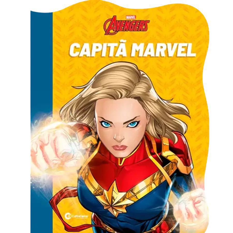 Livro ilustrado inspirado na Capitã Marvel Disney, com capa fosca e verniz localizado. Formato recortado divertido, ideal para presentear e usar como lembrancinha de festa.