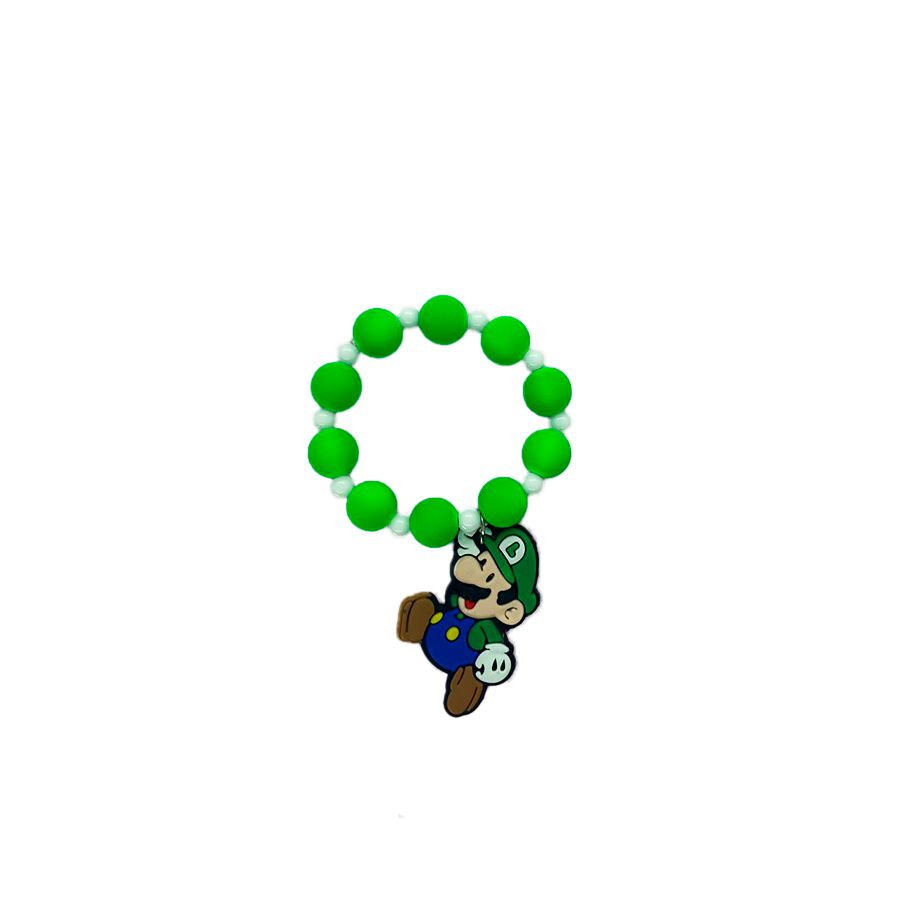 Contém uma pulseira de elástico com miçangas brancas e verdes com o Personagem Luigi do jogo Super Mario.