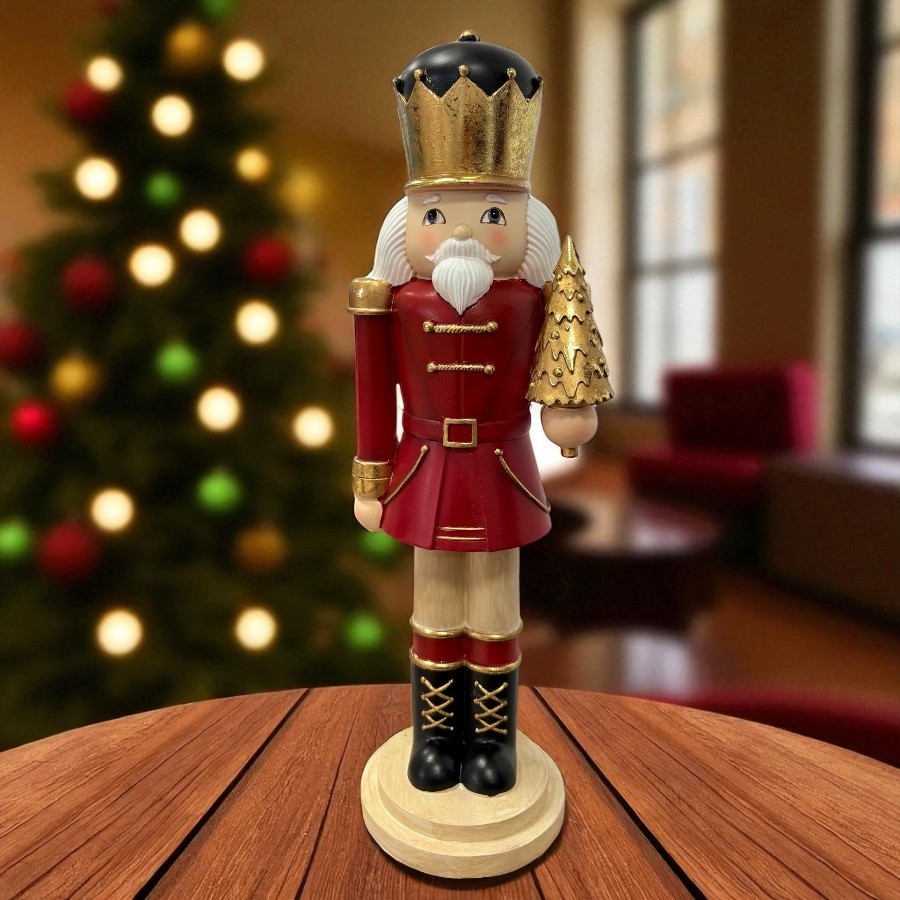 Quebra Nozes de 38 Centímetros segurando uma Árvore de Natal dourada.