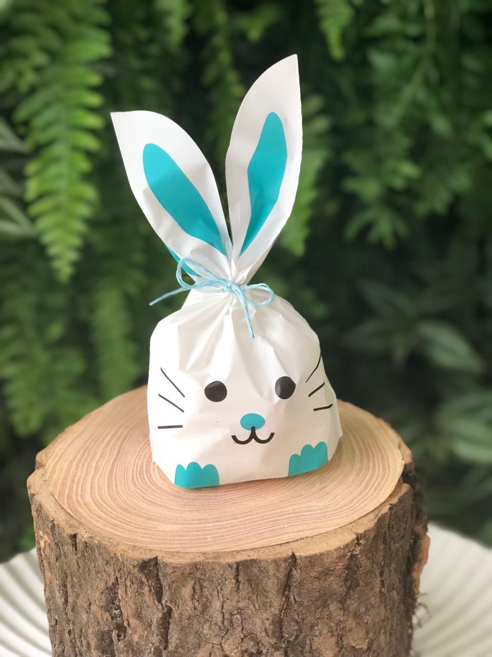 Dica: Após fechá-las com laço especial e colorido, você poderá também usar as Sacolas Coelho como decoração na sua mesa de Festa Páscoa.