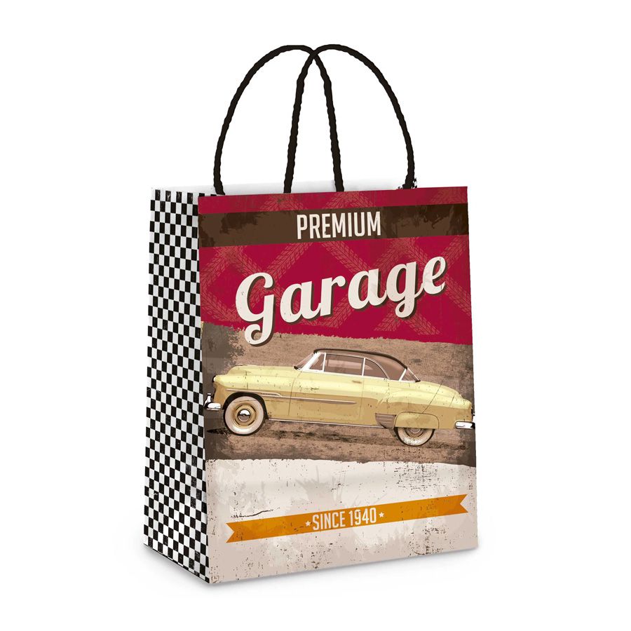 Possui 10 sacolas de papel no tamanho P e tema garage