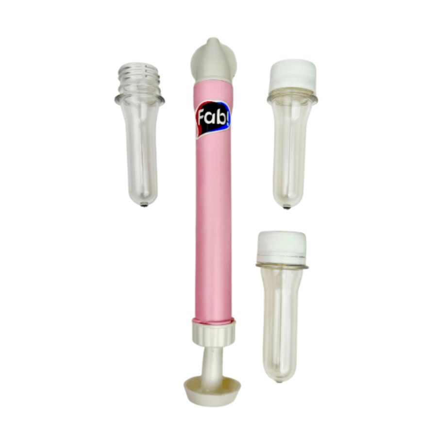 Pulverizador culinário rosa bebê, ideal para aplicar glitter, pó decorativo e corantes em bolos, doces e sobremesas, com tubetes e caninho de sucção inclusos, compatível com embalagens da marca FAB.