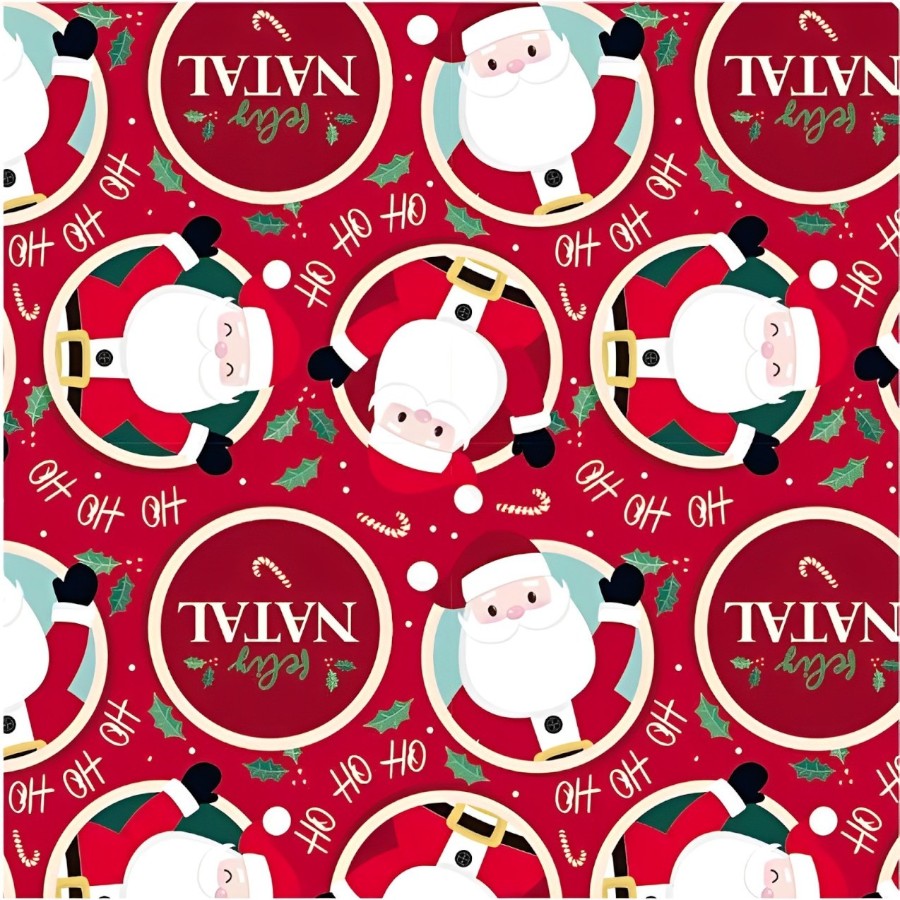 Saco para presente, com estampa temática natalina, de fundo vermelho, destacando circulos, com mensagens desejando "Feliz Natal, e outros circulos com o papai noel em poses diferentes