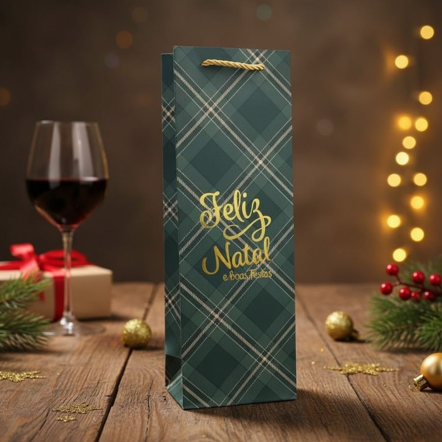 Sacola premium para garrafa, resistente e decorada com tema natalino, ideal para presentes elegantes de fim de ano.