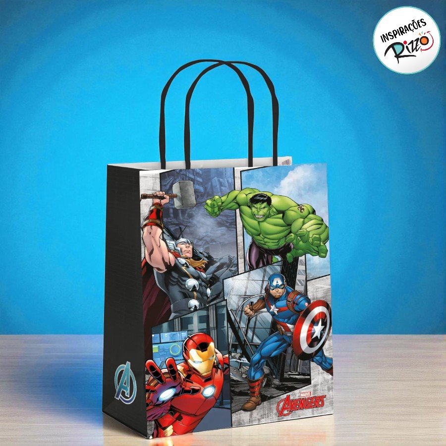 A arte da sacola é inspirada nos personagens clássicos dos Vingadores Marvel, tornando-a uma opção versátil tanto para aniversários quanto para eventos comemorativos. Pode ser combinada com caixas surpresa, tags personalizadas e balões do mesmo tema, todos vendidos separadamente.