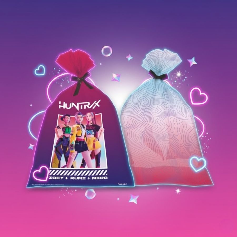 Sacola temática do universo Guerreiras do K-pop, ideal para lembrancinhas e doces, com design vibrante e acabamento resistente.
