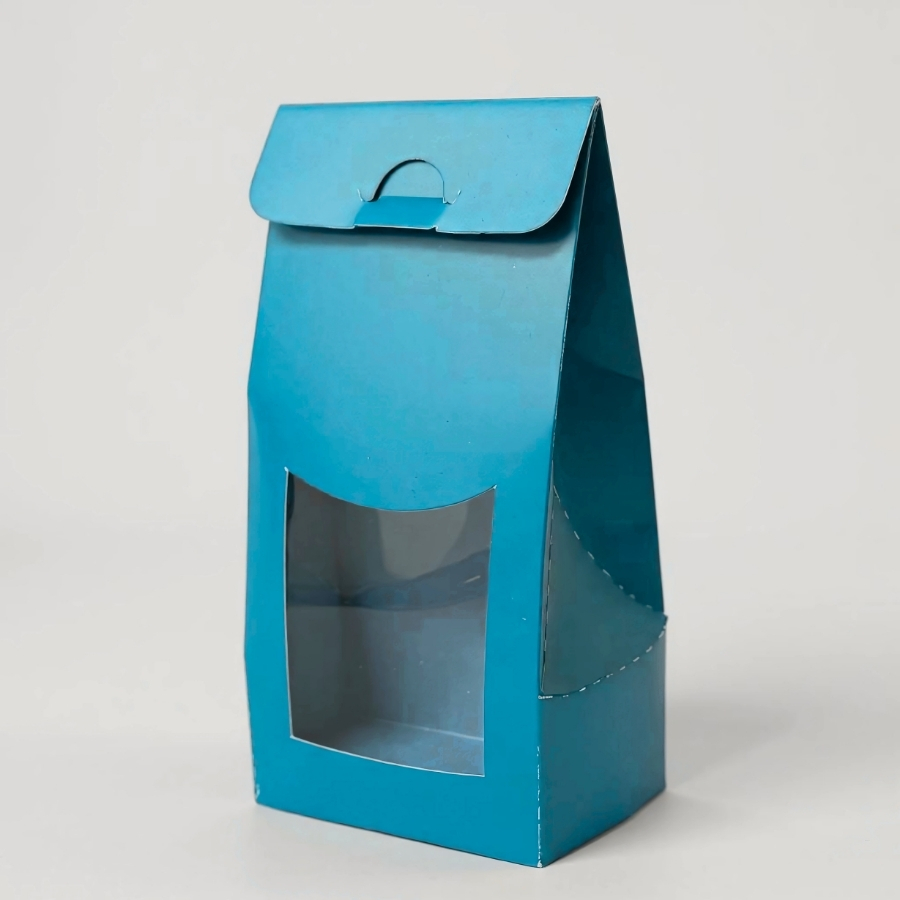 Sacola pequena em papel, na cor azul, com visor transparente em acetato. Mede 7,5x19x6cm. Possui alças resistentes. Indicada para acomodar lembrancinhas, doces ou brindes em eventos diversos.