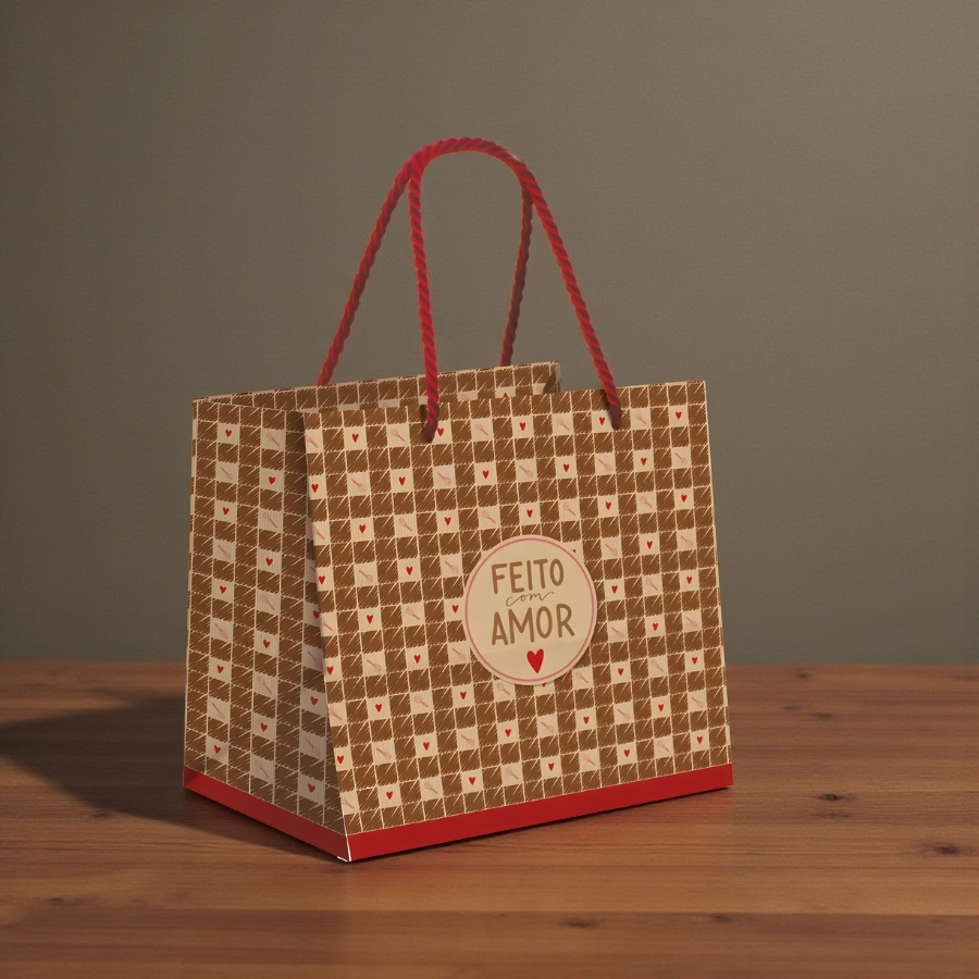 Indicada para chocolaterias, lojas de presentes e produtores artesanais, esta sacola resolve o desafio de unir praticidade e beleza em uma única embalagem. Seu estilo “Feito com Amor” transmite cuidado e atenção aos detalhes, tornando o momento de presentear ainda mais especial e memorável.