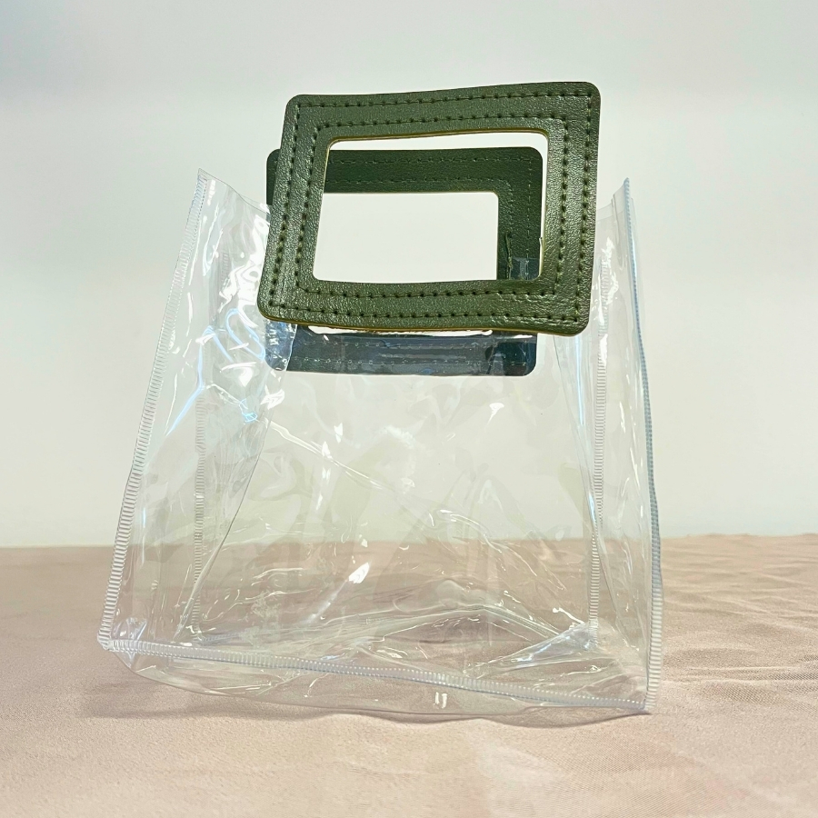 Sacola em PVC transparente com alça quadrada de couro, 15x15x10cm, prática, resistente e estilosa, nas cores verde musgo e marrom.