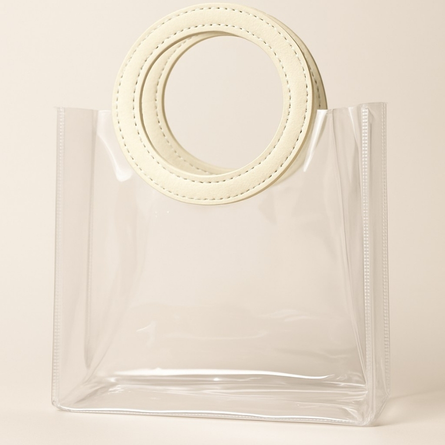 Sacola em PVC transparente com alça de couro redonda, 15x15x10cm, compacta, estilosa e disponível em várias cores para uso diário ou presente.