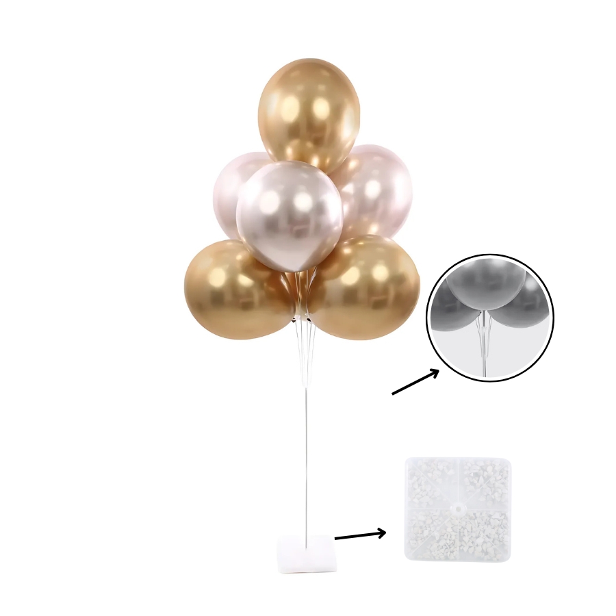 Suporte completo para decoração com balões, fácil de montar, versátil e ideal para uso em festas. A base deve ser preenchida com pedrinhas para maior firmeza.