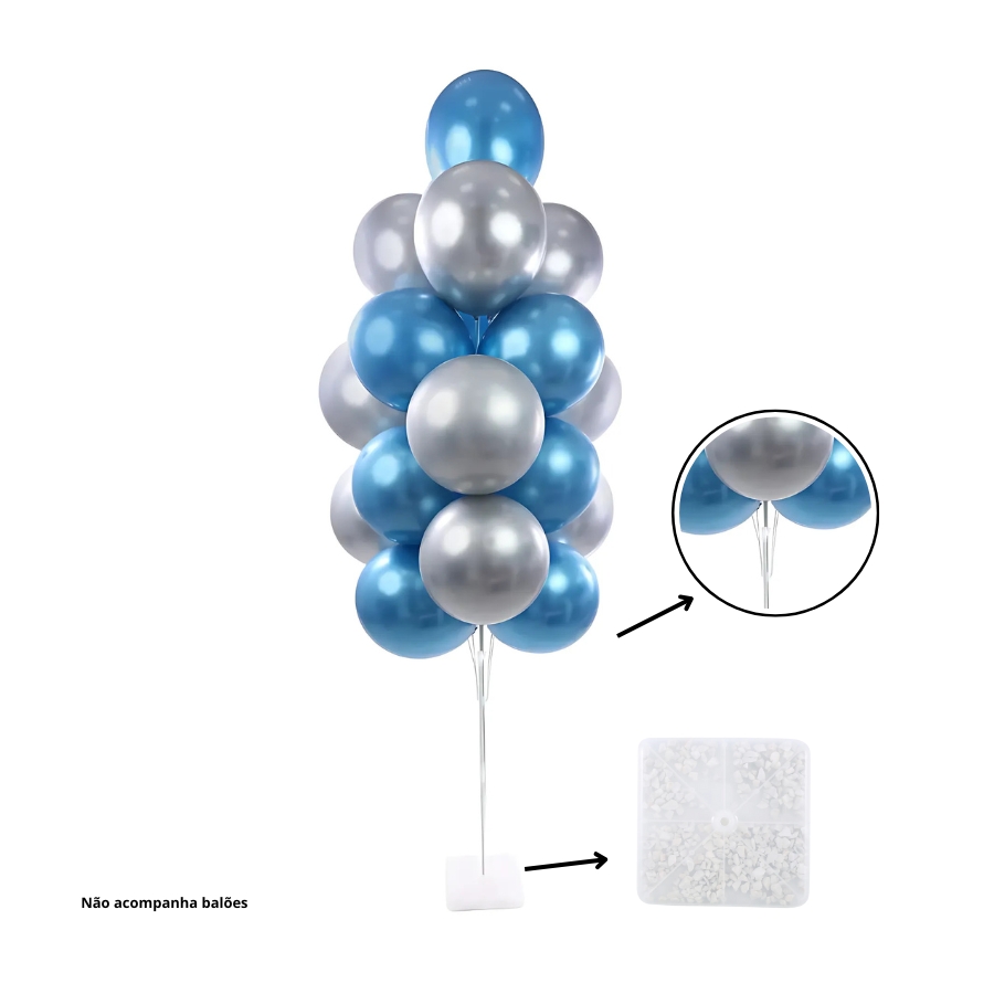 O Suporte Para Balões possui 1,85m de altura, com hastes de fibra medindo 40cm e 20cm, permitindo a montagem de estruturas versáteis e bem distribuídas.