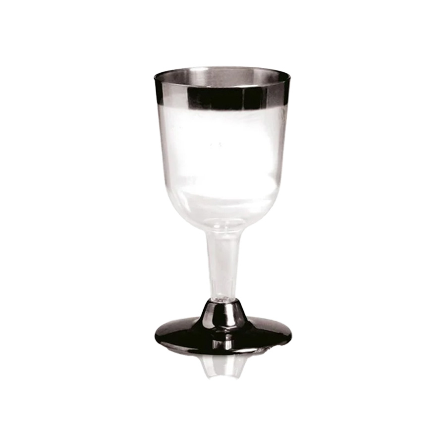 Com uma base removível para fácil armazenamento e transporte, estas taças são ideais para eventos ao ar livre, festas ou qualquer ocasião onde a praticidade é essencial. As bordas do bucal e a base prateadas adicionam um toque de elegância, elevando qualquer evento com um toque de brilho e estilo. Desfrute de seus vinhos favoritos com estilo e conveniência com estas taças de vinho descartáveis de luxo.