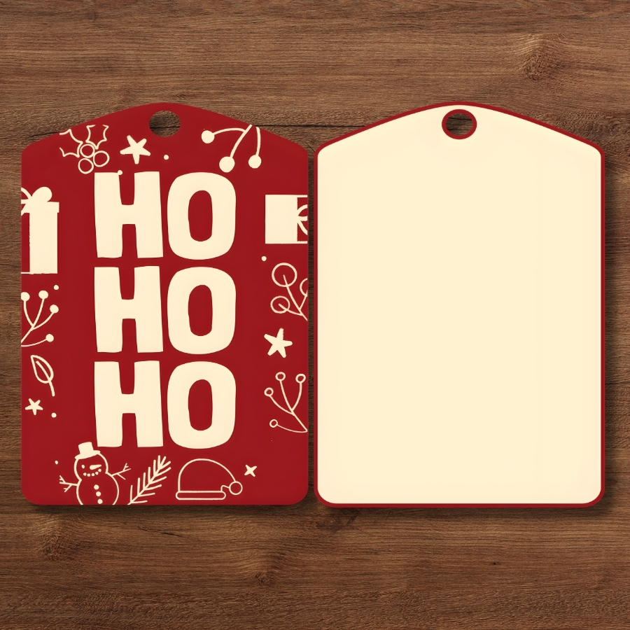 O lado frontal apresenta fundo vermelho com a frase “HO HO HO” em letras brancas grandes, decorada com ilustrações de elementos natalinos, como boneco de neve, gorro de Papai Noel, presentes, estrelas e ramos, proporcionando um visual alegre e festivo. O lado posterior possui fundo bege claro totalmente em branco, ideal para escrever mensagens personalizadas. Essa tag é perfeita para embalagens natalinas, kits de presente e decorações artesanais, agregando charme, praticidade e alegria ao Natal.