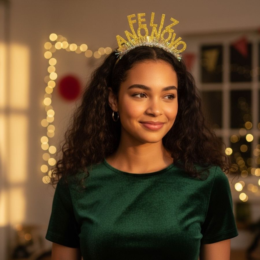 Leve, confortável e fácil de usar, a tiara possui estrutura flexível que se adapta bem à cabeça, sendo indicada tanto para adultos quanto para crianças. Seu brilho dourado reflete o espírito de prosperidade e alegria da ocasião, tornando-se um item indispensável para quem quer entrar no novo ano com muito glamour.