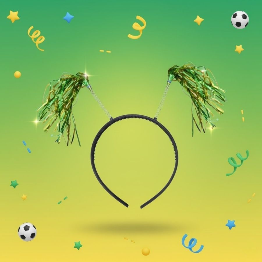 Tiara temática com acabamento em rafia e pompons verde e amarelo, ideal para torcida e Carnaval.