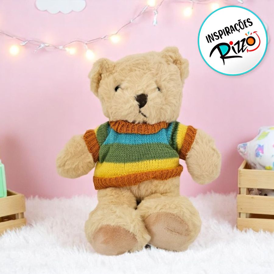 O Urso de Pelúcia com Suéter Colorido - Bege - 29cm é fofo, alegre e aconchegante. Perfeito para presentear com carinho ou dar um toque divertido à decoração.