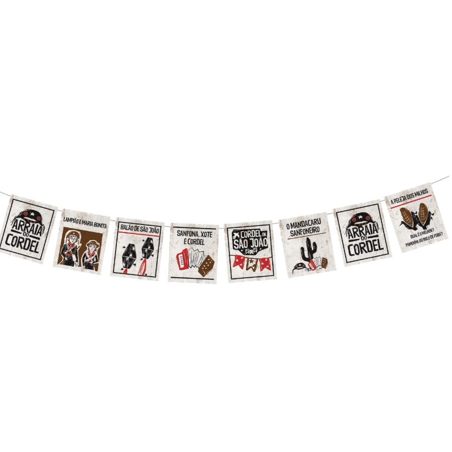 Varal Cordel de 180x16cm, com bandeirolas estampadas e temática nordestina, ideal para criar uma decoração com identidade e charme típico.