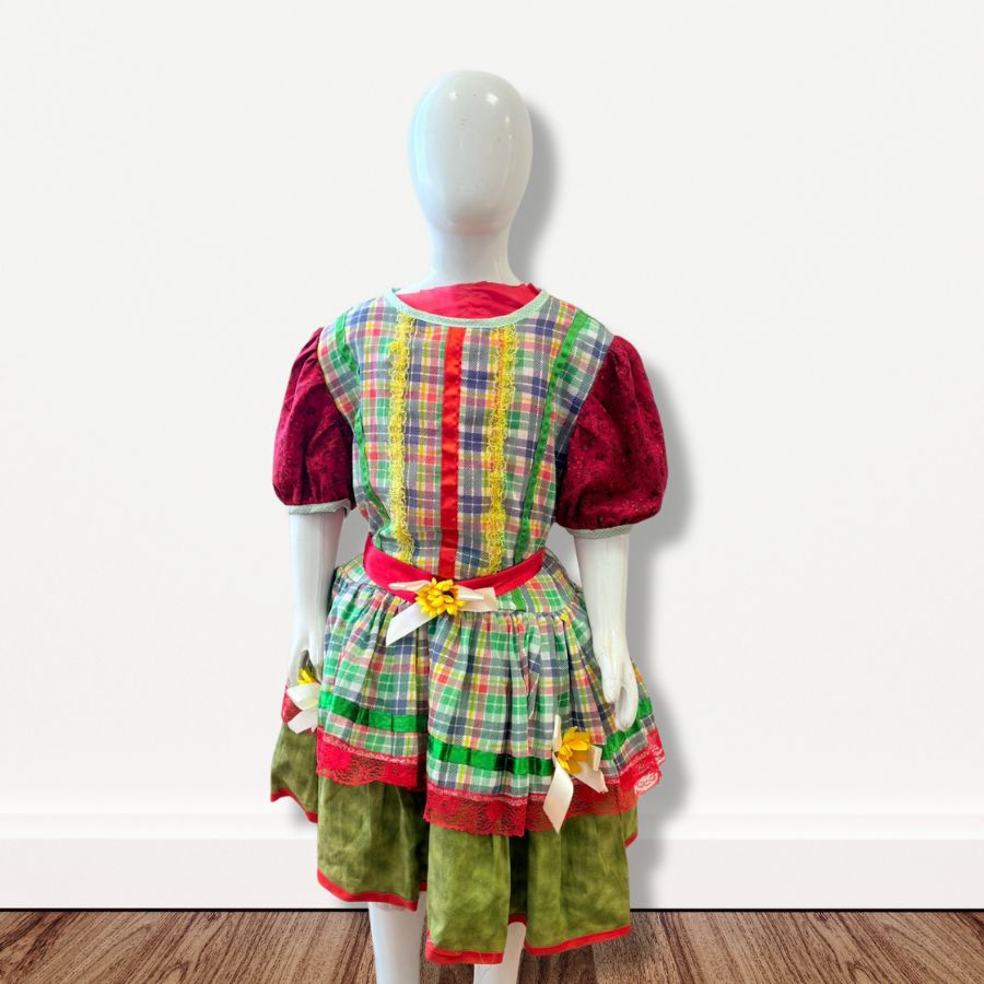 Além de estiloso, o modelo proporciona conforto e liberdade de movimento, permitindo que as crianças brinquem e dancem à vontade durante as comemorações. É indicado para pais que procuram uma fantasia junina prática, bonita e cheia de detalhes que valorizem o espírito das festas típicas.